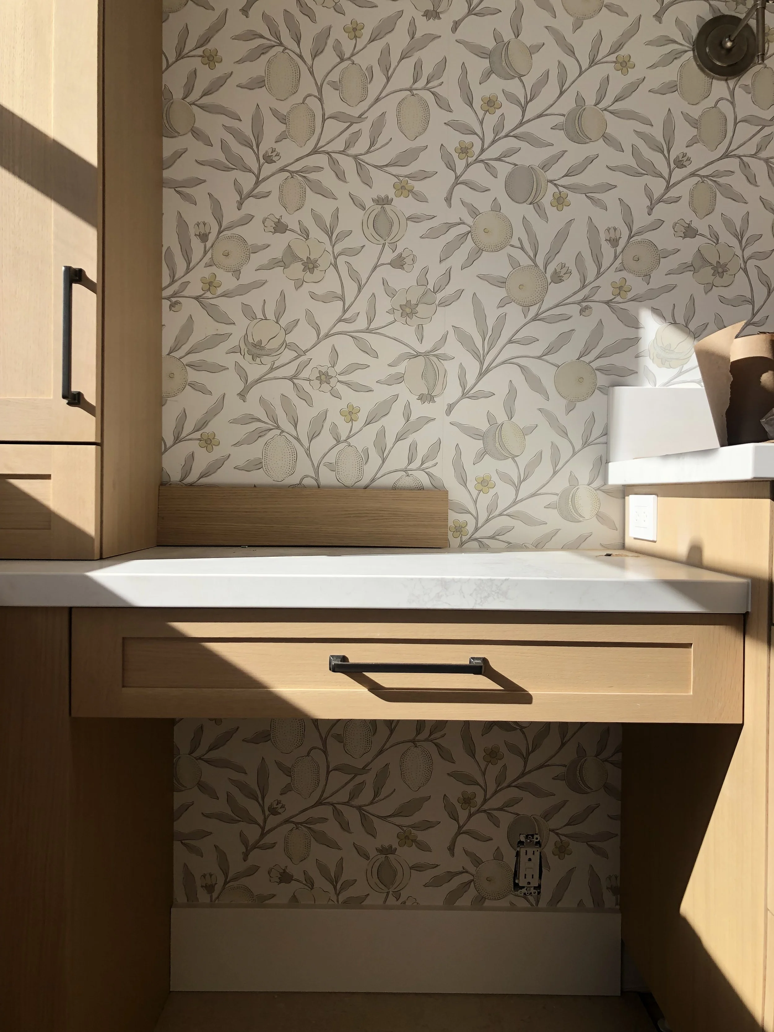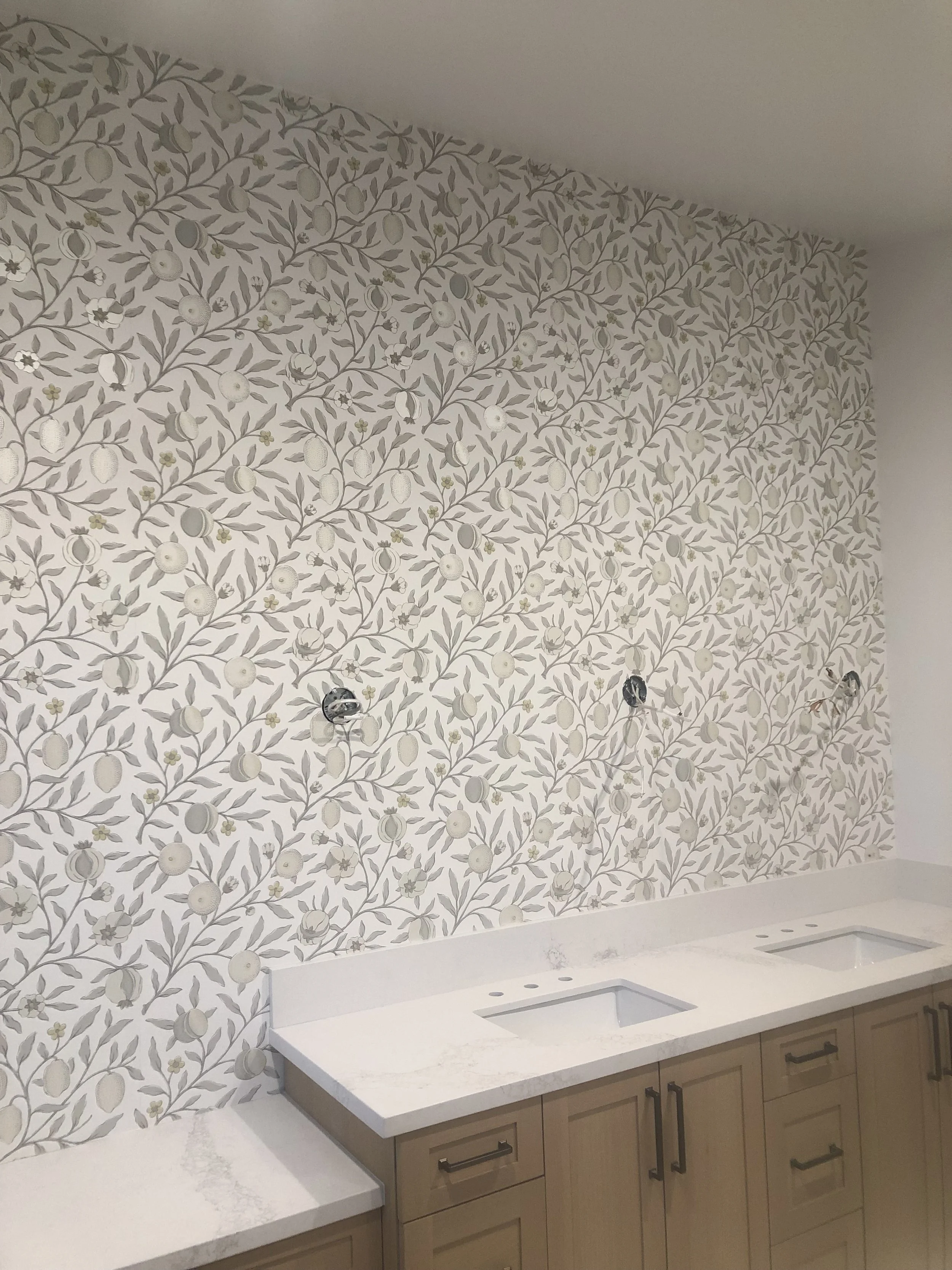 Funny story: I was installing beautiful Morris and Co. wallpaper in a remodeled primary bathroom and it was going so smooth! It was five panels and the ceilings were tall but not super tall, and I kept taking in the wall from the vanity countertop and up. The vanity was primarily made up of cabinets for storage, so in my mind, I blocked off the lower level of the wall. I had previously installed at this client’s home in the powder room and was hustling to finish this portion of the job by the end of the day.